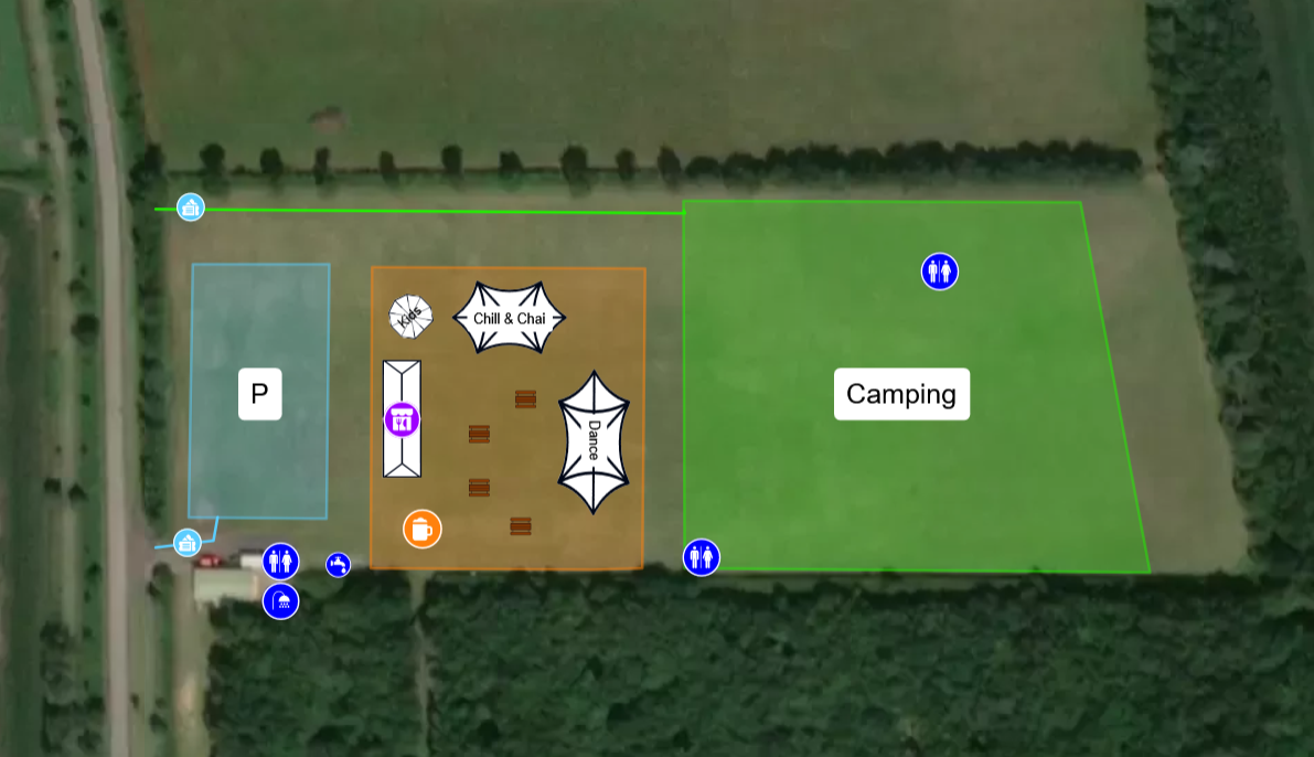 Auf dem Gelände stehen 5 kostenlose Duschen zur Verfügung (unisex). Daneben gibt es einen Toiletten-Container mit 4 WCs und 2 Dixis. Die Standorte findet ihr auf dem Lageplan.
